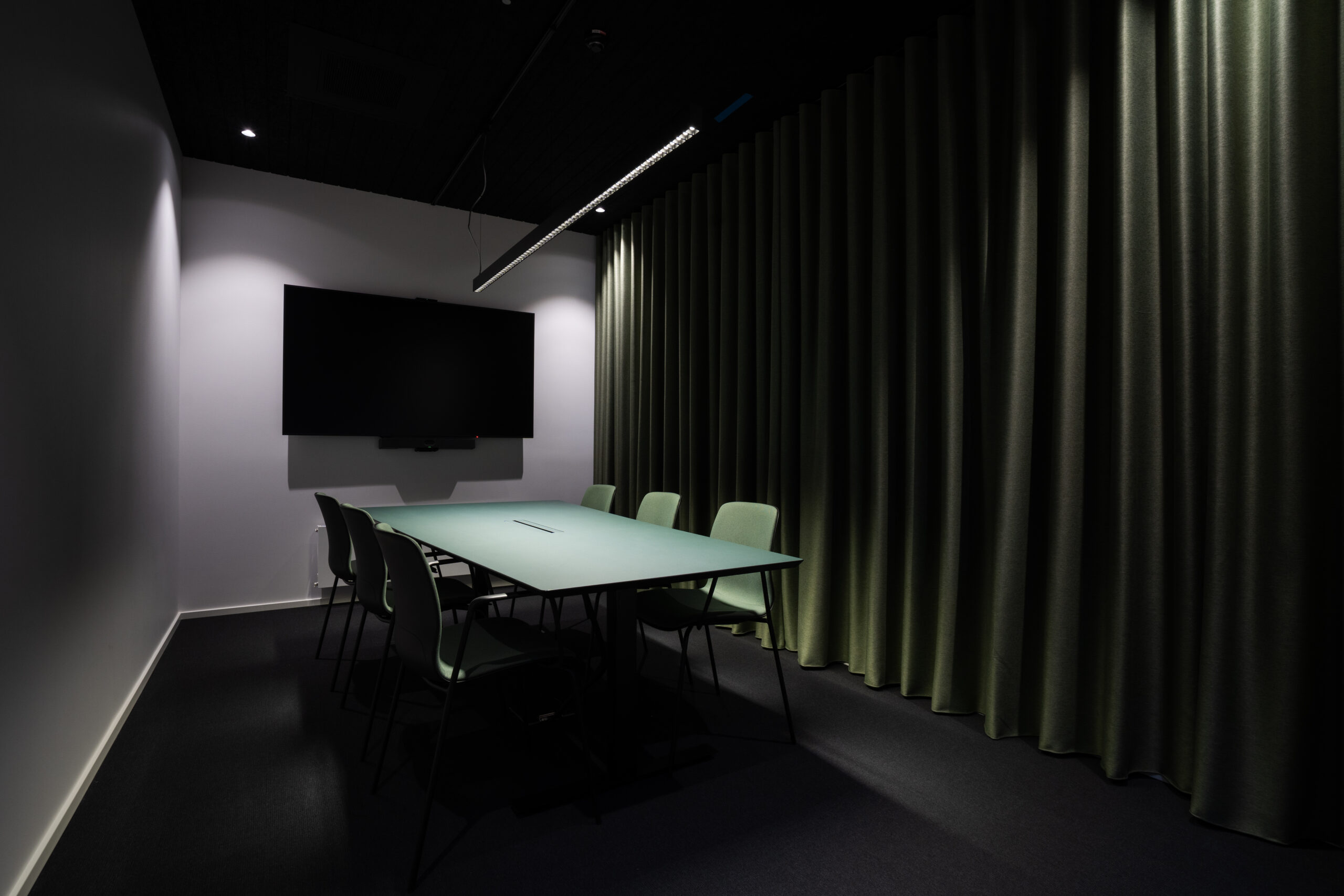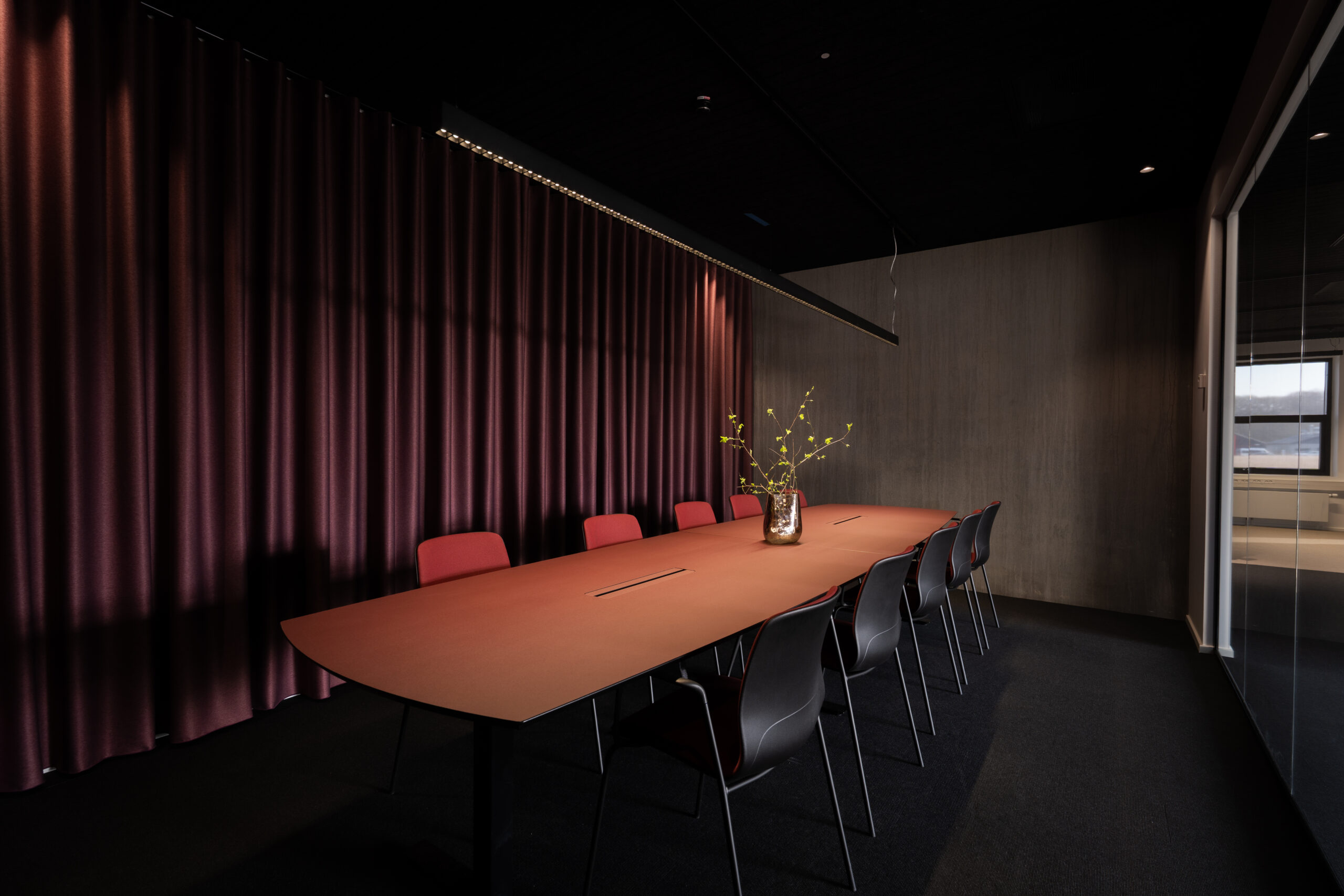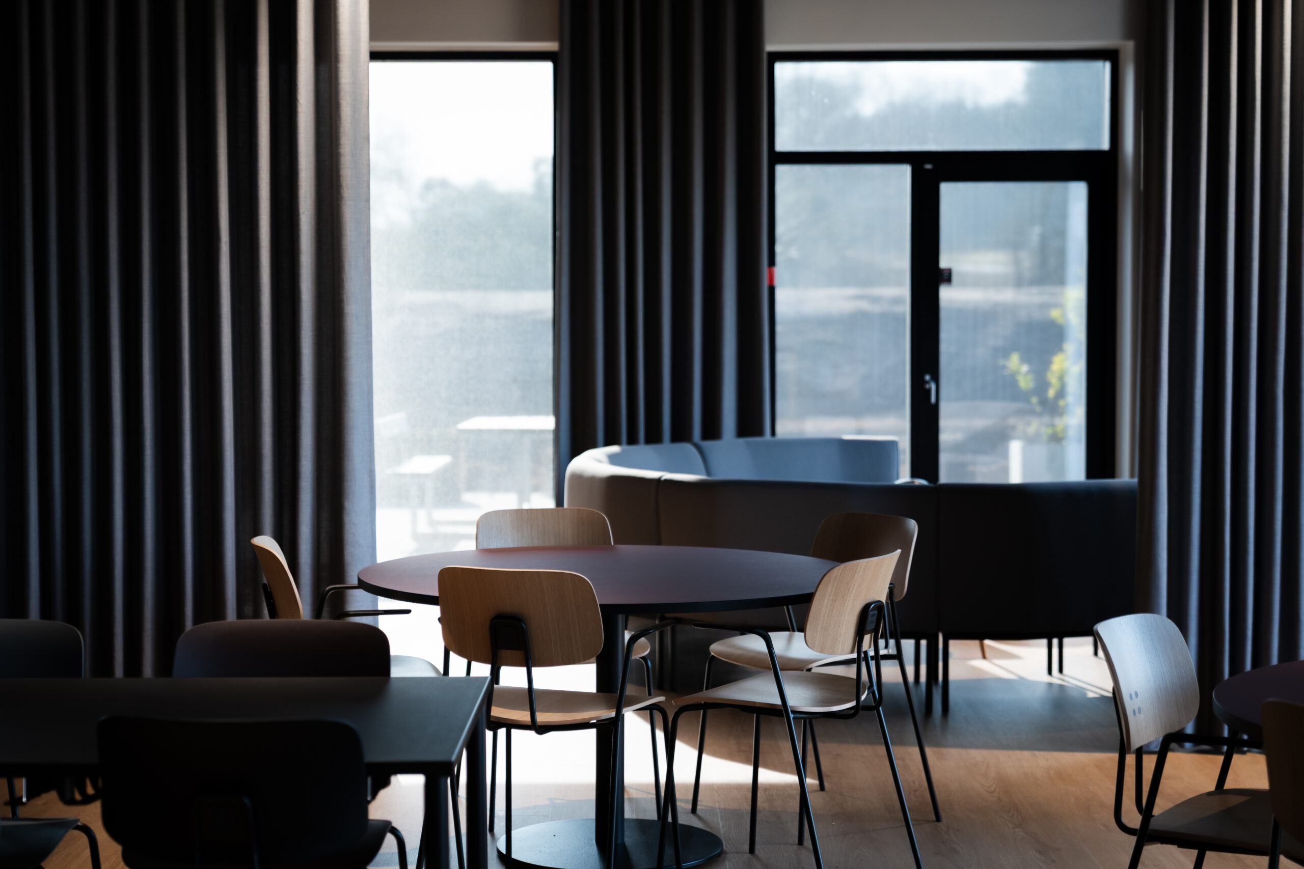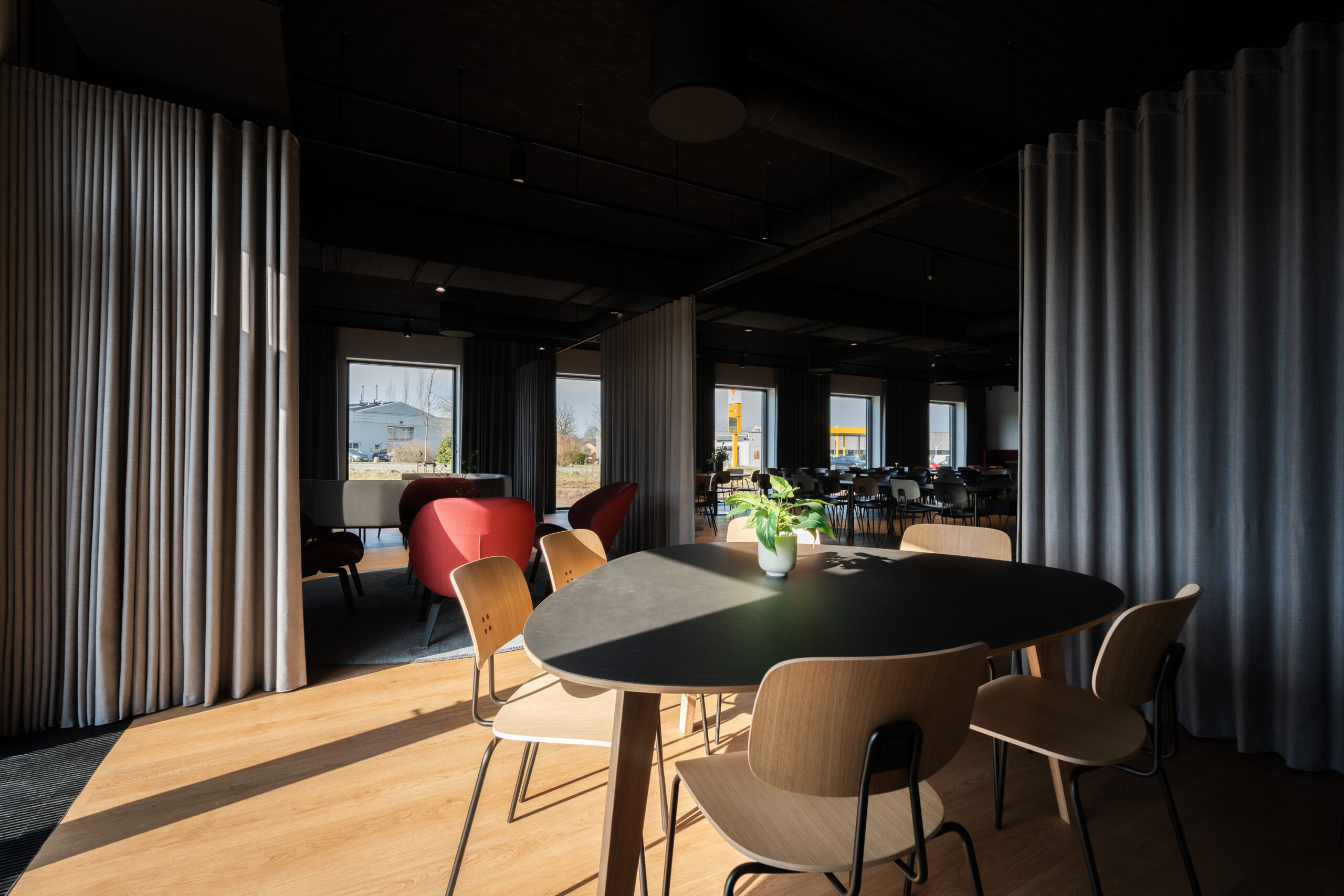 I kantinen var det vigtig at gardinerne kunne fungere som fleksible rumdelere samtidig med en vis akustikdæmpning. Resultatet blev brug af en varm grå tekstil monteret på sorte skinner nedstroppet fra loftet for at omgå ventilation m.m.