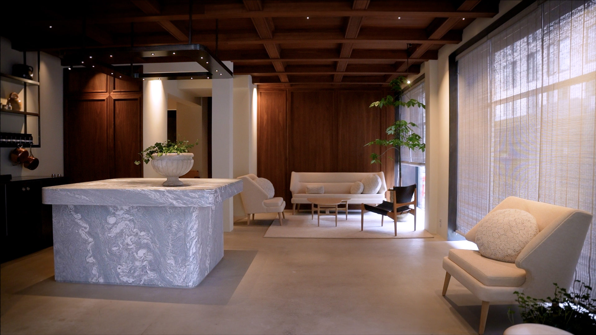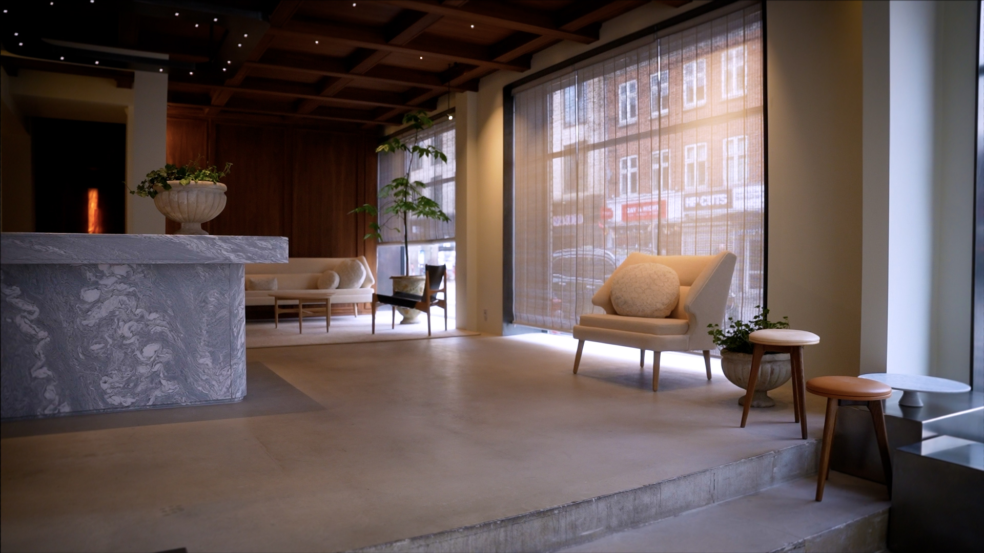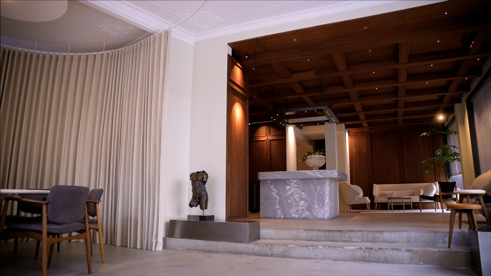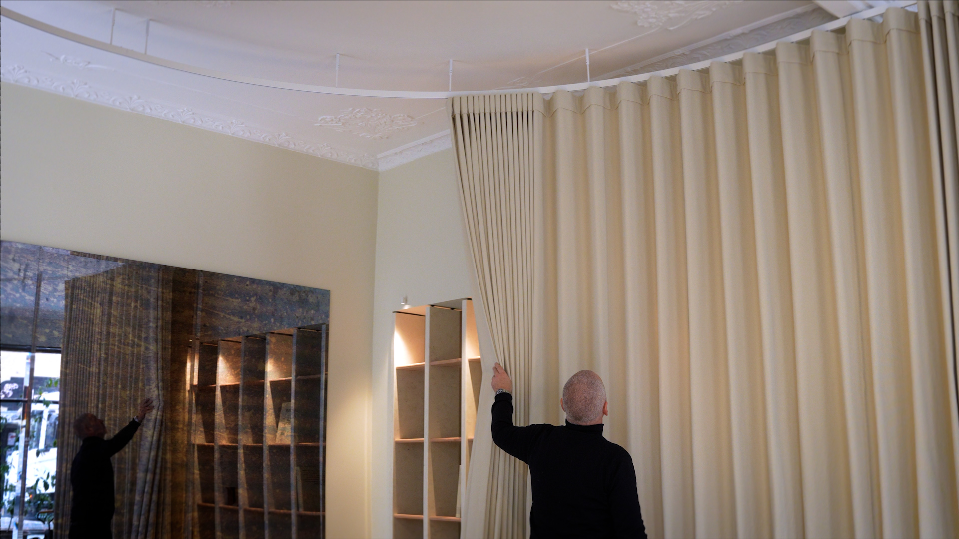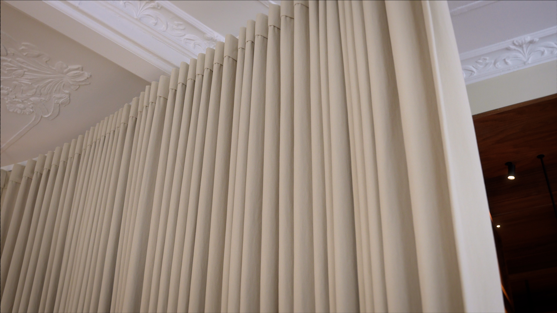 Resultatet er et dynamisk rum, hvor gardinerne bidrager aktivt til atmosfæren og funktionaliteten. En løsning, der både respekterer det håndværksmæssige udtryk og de æstetiske ambitioner, som kendetegner Skovgård Jensen og PN Snedkeri.
