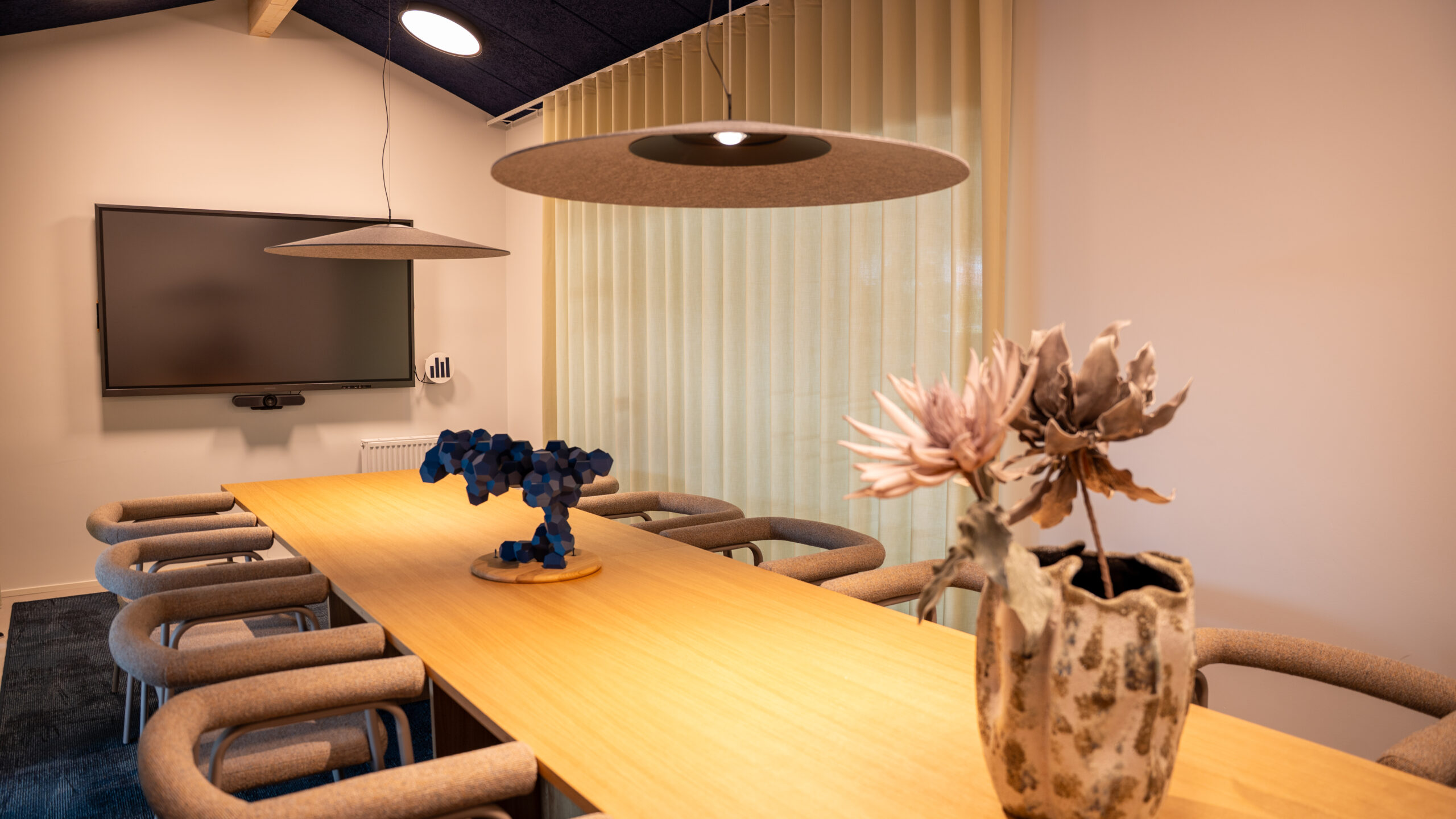 I tæt dialog med indretningspartneren Risom Design leverede Bolig-Art specialsyede gardiner, som spiller en central rolle i det samlede resultat. Gardinerne tilfører blødhed, farve og visuel sammenhæng til det nordiske og urbane kontormiljø. Samtidig fungerer de som akustikdæmpende løsninger og effektiv solafskærmning, hvilket skaber optimale rammer for både arbejde og møder.